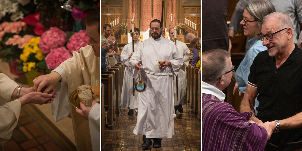 As worshipers, we are not spectators but full participants, employing all our senses: seeing colors and movements, hearing voices raised in song, feeling each others’ touch in the sharing of peace, tasting the bread and wine of Holy Communion, and smelling clouds of incense on feast days. We move our bodies to the rhythm of these traditions—standing, sitting, kneeling, bowing, tracing the sign of the cross—worshiping in the same four-part order practiced by early Christians: